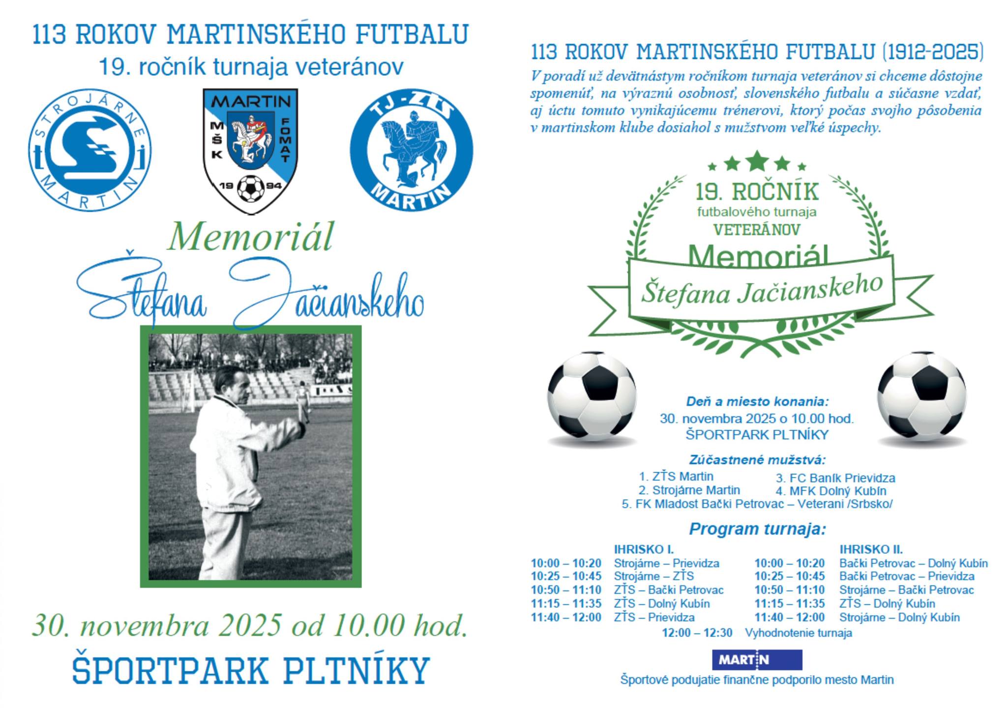 V nedeľu 30. novembra budú Pltníky hostiť už v poradí 19. edíciu turnaja veteránov, ktorý nesie meno velikána martinského i slovenského futbalu – Štefana JAČIANSKEHO. Tento rok bude turnaj s medzinárodnou účasťou, keď naše pozvanie prijali priatelia z Báčskeho Petrovca. Od 10:00 si to v 20 minútových zápasoch medzi sebou rozdajú tímy ZŤS Martin, Strojárne Martin, FC Baník Prievidza, MFK Dolný Kubín a už spomínaný Báčsky Petrovec. Slávnostné vyhodnotenie turnaja bude od 12:00. Srdečne Vás pozývame uctiť si túto vzácnu osobnosť, pozrieť si kvalitné zápasy v podaní veteránov a zabaviť sa pri dobrom futbale!
