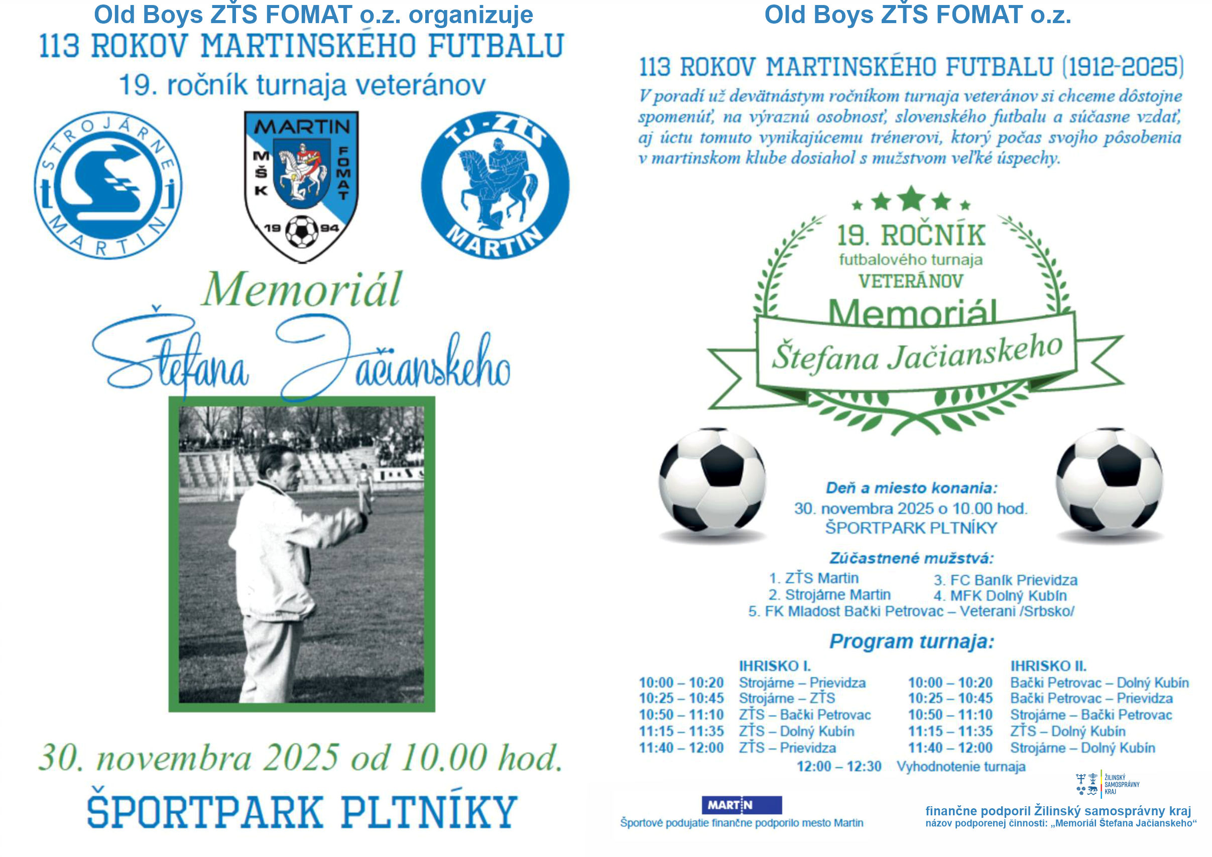 V nedeľu 30. novembra budú Pltníky hostiť už v poradí 19. edíciu turnaja veteránov, ktorý nesie meno velikána martinského i slovenského futbalu – Štefana JAČIANSKEHO. Old Boys ZŤS FOMAT o.z. organizuje tento rok turnaj s medzinárodnou účasťou, keď naše pozvanie prijali priatelia z Báčskeho Petrovca. Od 10:00 si to v 20 minútových zápasoch medzi sebou rozdajú tímy ZŤS Martin, Strojárne Martin, FC Baník Prievidza, MFK Dolný Kubín a už spomínaný Báčsky Petrovec. Slávnostné vyhodnotenie turnaja bude od 12:00. Srdečne Vás pozývame uctiť si túto vzácnu osobnosť, pozrieť si kvalitné zápasy v podaní veteránov a zabaviť sa pri dobrom futbale! Zároveň by sme chceli poďakovať v mene Old Boys ZŤS Fomat o.z. mestu Martin a Žilinskému samosprávnemu kraju za finančnú podporu tohto podujatia.