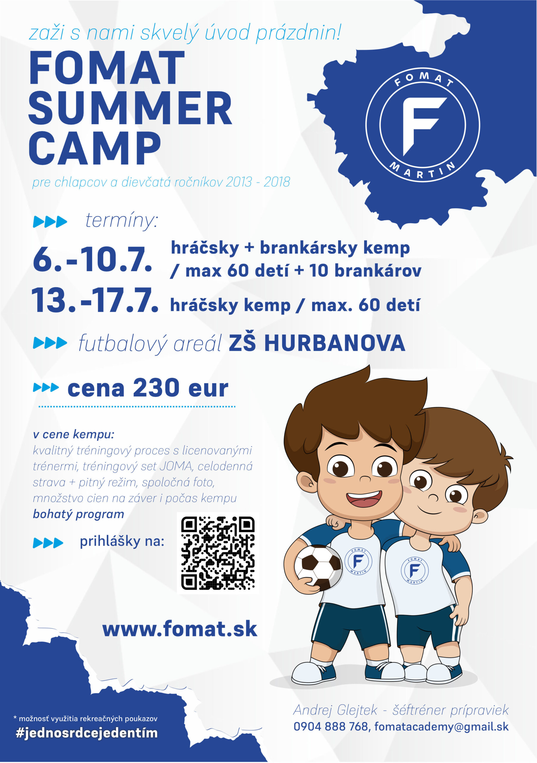 Futbalový klub MŠK FOMAT Martin aj tento rok pripravuje pre najmladšie talenty futbalové kempy v dvoch termínoch – od 6. júla – 10. júla a od 13. – 17. júla 2026. V prvom termíne sa jedná o hráčsky aj brankársky kemp, druhý je určený pre hráčov. Aj tento rok máme pripravené veľké množstvo noviniek. Futbalové kempy sú určené prioritne pre hráčov a hráčky prípraviek a mladších žiakov – teda deti s rokom narodenia 2013 až 2018. Kempy sa skutočnia v krásnom prostredí v priestoroch ZŠ s MŠ Hurbanova, kde budeme mať k dispozícií okrem futbalového ihriska s umelou trávou aj priestory telocvične, outdoorovej učebne i priestranných šatní. Budú ich viesť licencovaní tréneri, ktorí si okrem klasického „futbalového drilu“ vo forme hier, pripravujú aj rôzne mimofutbalové aktivity ako napríklad: výlety, workshopy o zdravej strave, besedy a mnoho ďalších atraktívnych a zábavných činností.